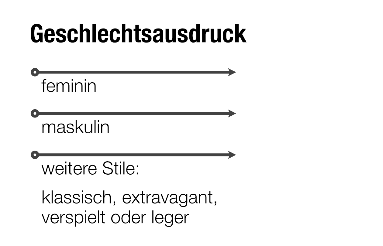 Bei vielen dieser Aspekte gibt es aber auch Facetten, die unabhängig von feminin/maskulin sind. So können wir sagen, dass es parallel auch noch weitere Stile gibt. Sie liessen sich z.B. einteilen in: klassisch, extravagant, verspielt, leger (basierend auf Stilberatung, Krüger, 2021).
