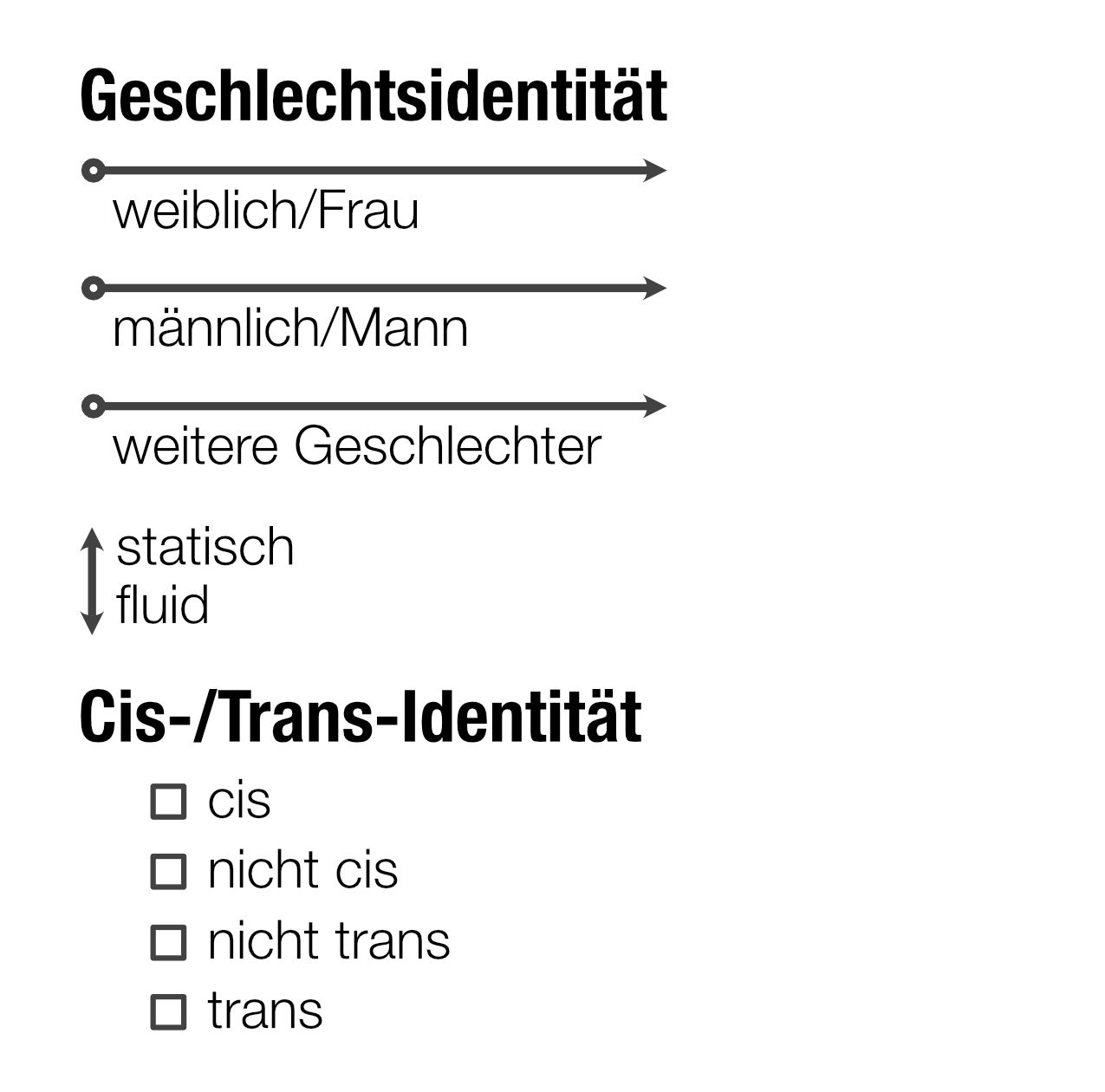 Gewisse Aspekte der Geschlechtsidentität können wir mit den oben beschriebenen drei Skalen schon recht präzise erfassen – auch viele non-binäre Geschlechter. Dabei ist zu berücksichtigen, dass gewisse Menschen sich eher als z.B. «Mann» bezeichnen und andere «männlich» bevorzugen. Verschiedene Beispiele für dieses Spektrum finden wir im Text Labels (nonbinary.ch, 2022). Die Geschlechtsidentität kann aber zusätzlich noch statisch (fix über die Zeit) oder eher fluide (veränderlich über die Zeit) sein.