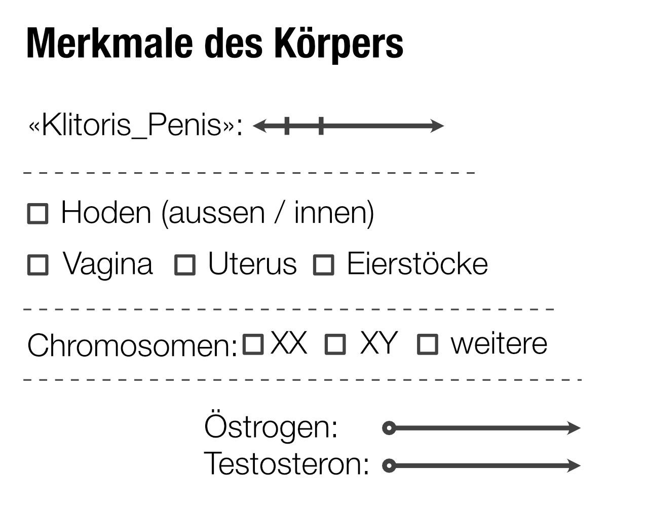 Wenn wir die Dimension von Körpermerkmalen abbilden wollen, dann ist es wenig sinnvoll, das mit den oben beschriebenen Skalen tun zu wollen. Die von Gender-Unicorn und Genderbread-Person gewählte Umsetzung «bei Geburt zugeschriebenes Geschlecht: männlich, intergeschlechtlich, weiblich» ist aber auch nicht wirklich befriedigend, weil das doch sehr allgemein ist. Auf der Ebene des Körpers scheint es präziser zu sein, die einzelnen Merkmale von Körpern – möglichst frei von geschlechtlichen Bezeichnungen – einfach zu benennen.