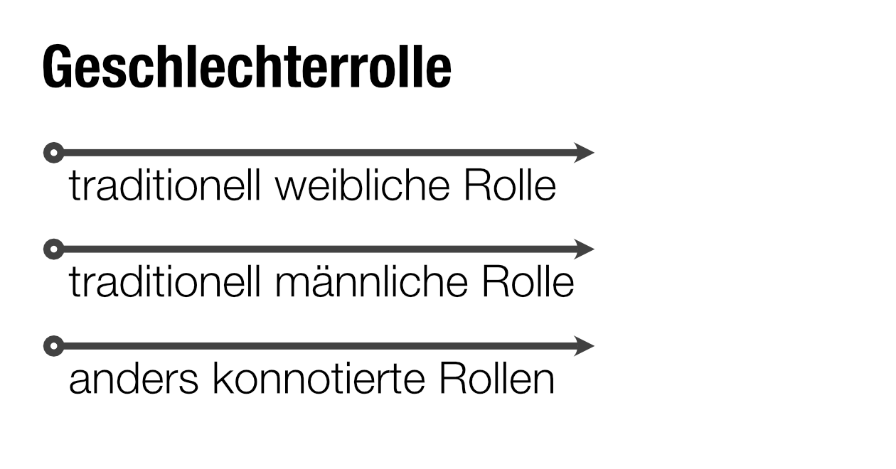 In den Bereichen Beruf, Hobbies, Familie und Beziehungen gibt es in unserer Gesellschaft gewisse Erwartungen, wie sich «Angehörige eines Geschlechts» zu verhalten haben. Dabei können wir sagen, dass es Geschlechterrollen gibt, die traditionell eher weiblich und solche, die eher männlich konnotiert sind. In den oben genannten Lebensbereichen gibt es aber auch Tätigkeiten oder Haltungen, die nicht unbedingt geschlechtlich konnotiert sind.